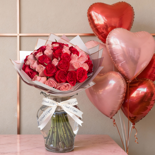Ramo de 50 Rosas Rojas y Blancas con Florero + Bouquet de Globos Inflados con Helio -SET102-