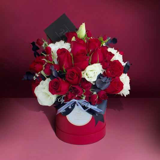 Arreglo Floral de Rosas Rojas, Mini Rosas y Lisianthus en Caja Premium -Domo Grand-