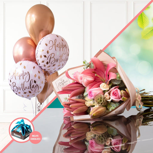 Ramo de Rosas, Lillies, Mini Rosas y Escabiosa con Globos de Cumpleaños-SET027-