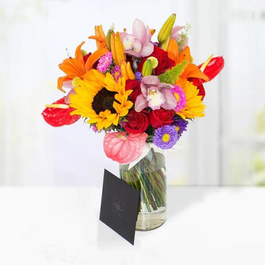 Arreglo de Rosas Rojas, Orquídeas, Anturios, Girasoles y Lillies + Burbuja Get Well Soon -SET046-