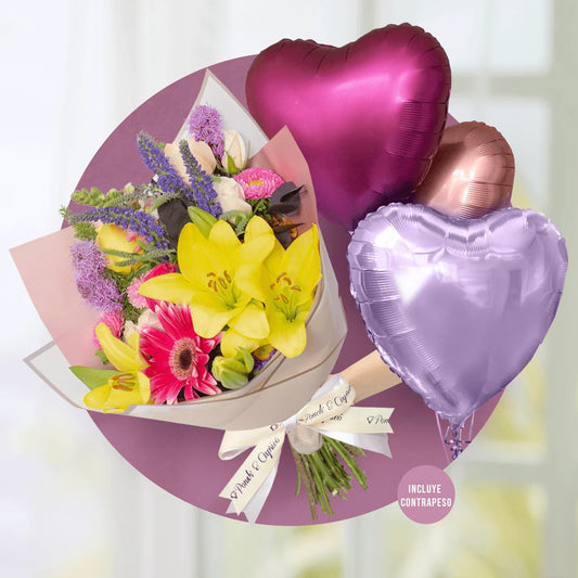 Rosas Lilas und Lisianthus Rosas Cream mit magischen Luftballons