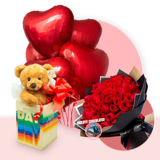 Red roses bouquet with inflated balloons with helium and teddy bear - Set083 -