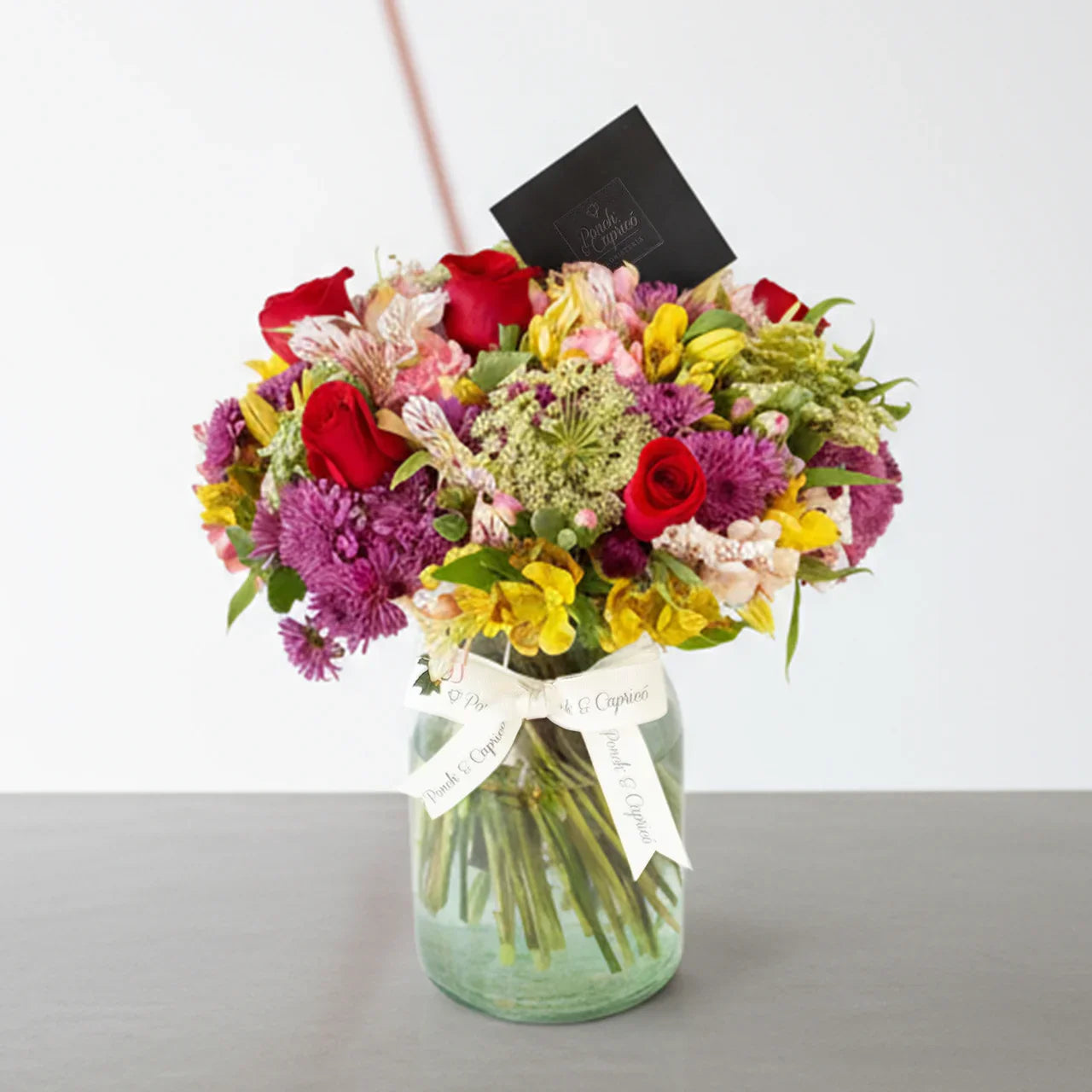 Un colorido y romántico arreglo floral presentado en un florero con agua, diseñado con rosas y hermosos follajes. Incluye tarjeta de dedicatoria impresa, listón de tela, y la opción de entrega a domicilio en Ciudad de México o retiro en tienda. ¡Con este regalo harás sonreír a tu ser querido!