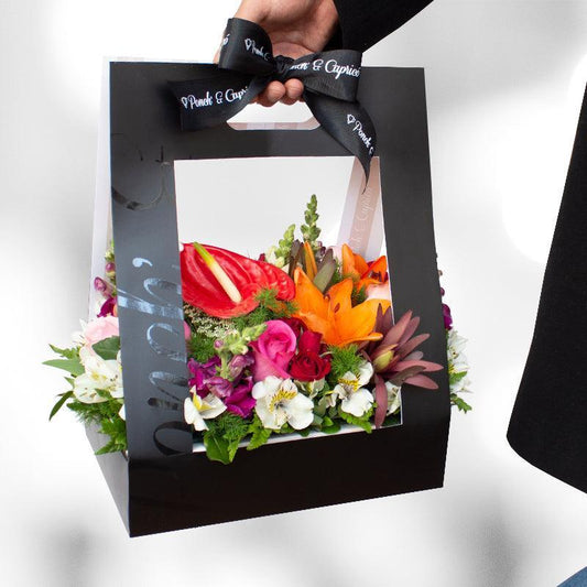 Отправьте цветы в коробках в форме корзины из одной из наших сезонных цветочных композиций; Розовые композиции, Мероприятия Герберы, Мероприятия подсолнухи, Мероприятия Лилии и микс живых цветов.