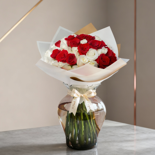 Ramo de 50 Rosas Rojas y Blancas con Florero + Bouquet de Globos Inflados con Helio -SET102-